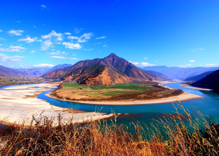 First Bend of the Yangtze River: Located in the Stone Drum Town, the First Bend of the Yangtze River is situated 1,850 meters above sea level, 130 km away from Shangri La County. The longest river, the Yangtze River, runs from the roof of the world, the- Qinghai-Tibet Plateau, and then into Yunnan Province, converging with the Lancang River and the Nu River in the mountain ranges. When coming to the Stone Drum in Yulong County, the river makes sudden 100 degree turn, heading northeast, and forming a V-shaped bend.