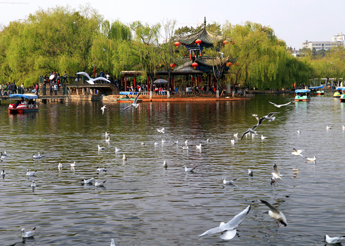 Green Lake: Located on the west side of Wuhua Mountain in Kunming, facing opposite Yunnan University, Green Lake Park is an urban park designed and created all the way back in the 17th century. Since 1985, a large number of seagulls have migrated there from Siberia to spend the winter. Green Lake is surrounded by verdant trees, with rippling water and pavilions dotted on the lake. With elegant and beautiful environment, it is reputed as “Jade of the City”.