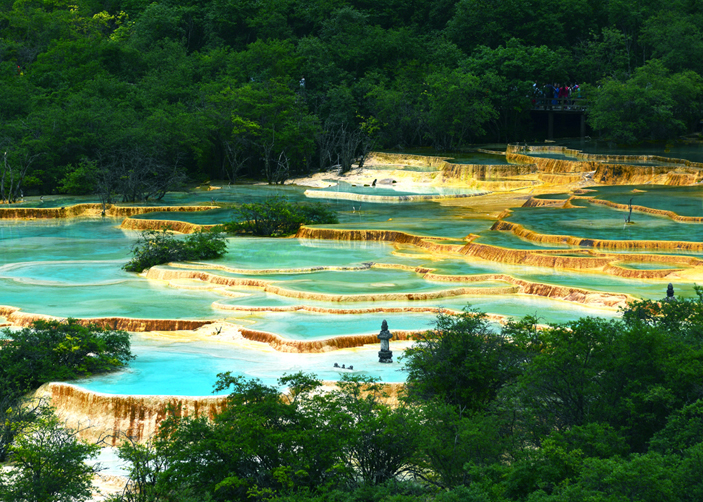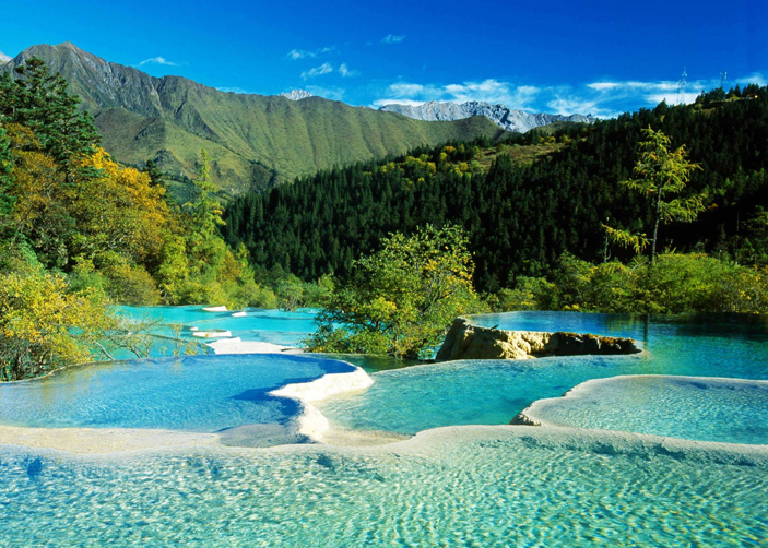 Huanglong National Park: Huanglong is located on the easternmost of Qinghai-Tibet Plateau and 300km away from Chengdu. It consists of numerous unique landscapes of geological landforms. Glacial revolution, terrane structure, stratum of carbonic acid rock, tufa water and climatic conditions such as artic-alpine sun light have created this world-famous travertine landscape. The park is famous for its colorful lakes, snow-topped mountains, beautiful valleys and virgin forests. The area, declared a World Heritage Site in 1992 by UNESCO, has been called a "World Wonder" and “Fairy Land on Earth.
