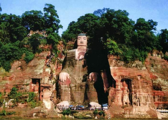 Leshan Giant Buddha: Located 125km away from downtown Chengdu, and covers 2.5 square kilometers, the 71m-high Giant Buddha is the biggest Buddha statue in the world. It sits in a cliff overlooking the confluence of Min, Dadu and Qingyi River. A local saying goes: "The mountain is a Buddha, and the Buddha is a mountain". Legend has it that an eminent monk Hai Tong of the Tang Dynasty (618-907) often saw boats capsize in the turbulent river. Shipwrecks were a common place. Wishing to protect passing boats and calm down the rough river currents, the monk vowed to build a Maitreya Buddha. He made great efforts to collect the funds for the construction.
