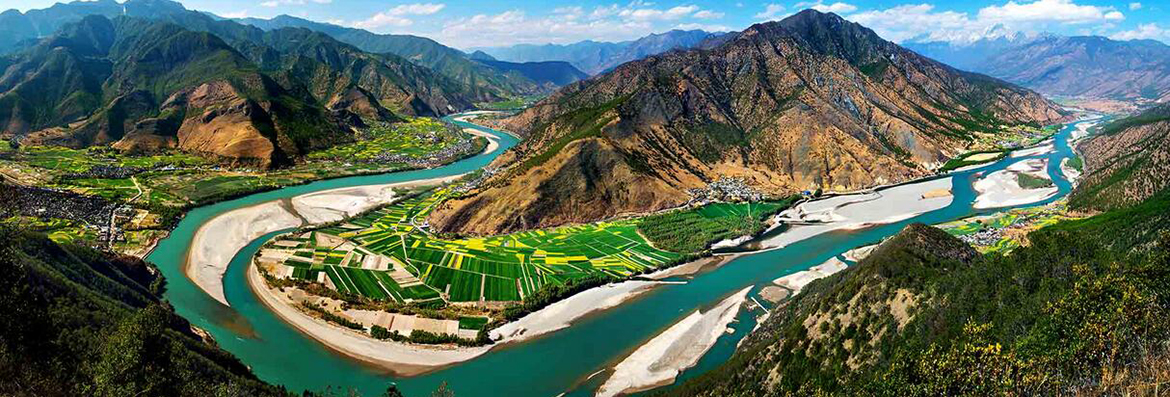 First Bend of the Yangtze River: Located in the Stone Drum Town, the First Bend of the Yangtze River is situated 1,850 meters above sea level, 130 km away from Shangri La County. The longest river, the Yangtze River, runs from the roof of the world, the- Qinghai-Tibet Plateau, and then into Yunnan Province, converging with the Lancang River and the Nu River in the mountain ranges. When coming to the Stone Drum in Yulong County, the river makes sudden 100 degree turn, heading northeast, and forming a V-shaped bend.