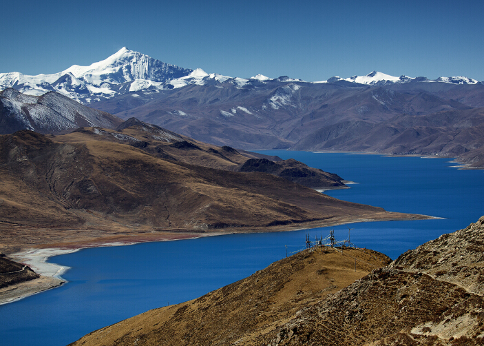 Yamdrok Lake: Which is one of the 3 most sacred lakes in Tibet. It is a lake of 72km long, fed by numerous small streams and sourrounded by snow covered mountains. The two long arms of water, makeing it look like a scorpion from the sky. According to legend, Yamdok Lake is the transformation of a goddess.