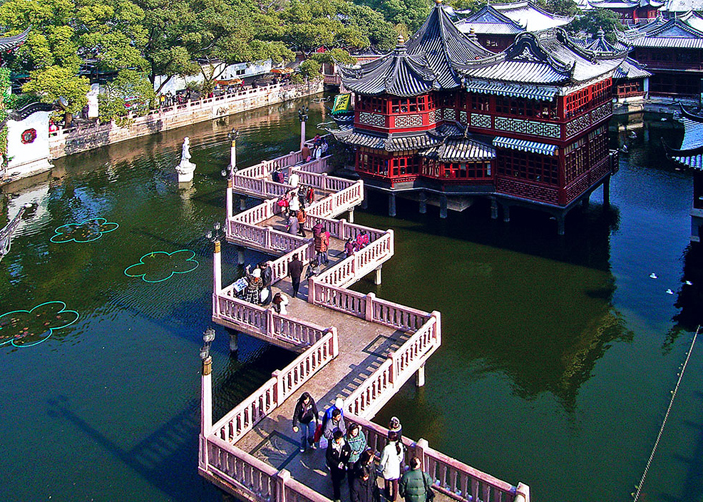 Yu Garden: Yuyuan Garden (Happy Garden) is one of the highlights of Shanghai. It isbelieved to have been built in the Ming Dynasty, more than 400 years ago, with an exquisite layout and beautiful scenery. The inner and outer gardens were both built in the Ming Dynasty classical style, with numerous rock and tree garden areas, ponds, dragon-lined walls and zigzagging bridges separating various garden areas and pavilions. It is in the center of Shanghai's Old City, a few blocks south of the Bund. The surrounding bazaar area has good shopping opportunities for traditional Chinese products, gold, and jewels.
